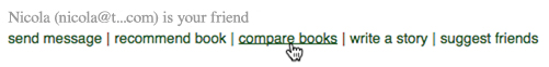 Also, if you have a Goodreads account, you can use the comparison tool (in my opinion, one of the niftiest things on there) to figure out how their taste compares to yours. On your friend’s profile, if you’re logged in, you simply click “compare books” and the system will show you which books you have both read (or want to read) and what you both rated them.