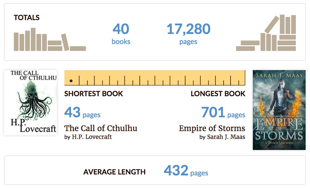 My Goodreads “Year in Books 2016” showing longest and shortest books. Image from Goodreads: https://www.goodreads.com/user/year_in_books/2016