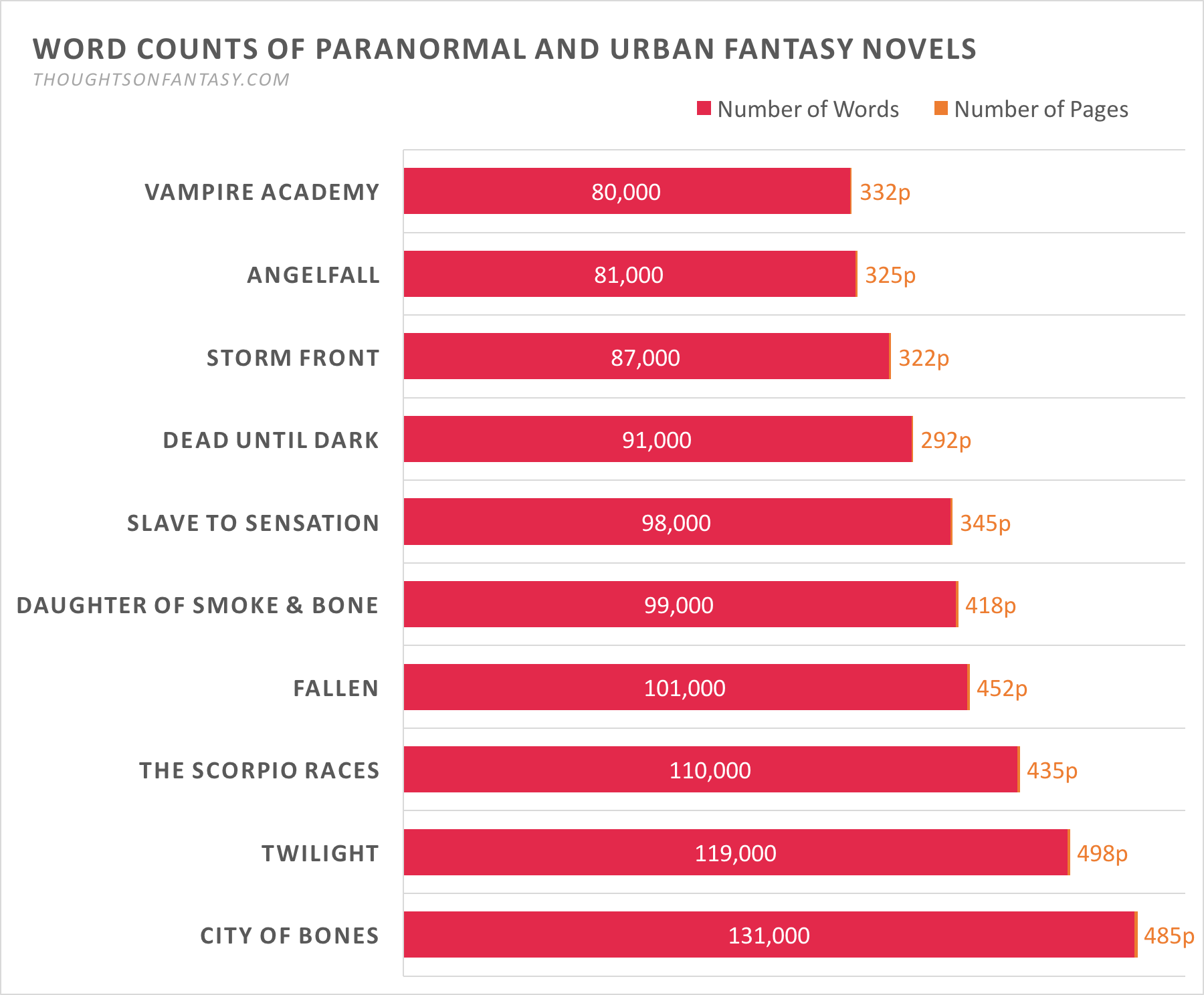 Popular paranormal and urban fantasy novels and their word and page lengths – City of Bones: 131,000 words, 485 pages; Twilight: 119,000 words, 498 pages; The Scorpio Races: 110,000 words 435 pages; Fallen: 101,000 words, 452 pages; Daughter of Smoke & Bone: 99,000 words, 418 pages; Slave to Sensation: 98,000 words, 345 pages; Dead Until Dark: 91,000 words, 292 pages; Storm Front: 87,000 words, 322 pages; Angelfall: 81,000 words, 325 pages; Vampire Academy: 80,000 words, 332 pages. Graph by Nicola Alter (Available for Use Under Creative Commons Attribution-ShareAlike License CC BY SA 4.0)