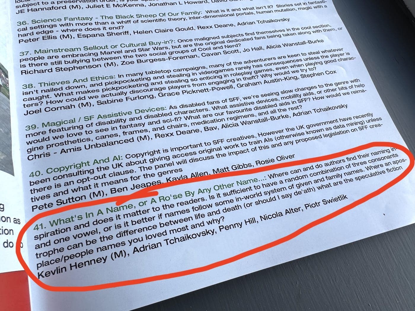 A printed programme page shows a list of scheduled panels, ending in one circled in red titled 'What's in a Name'. A topic description is followed by the names of the panellists.
