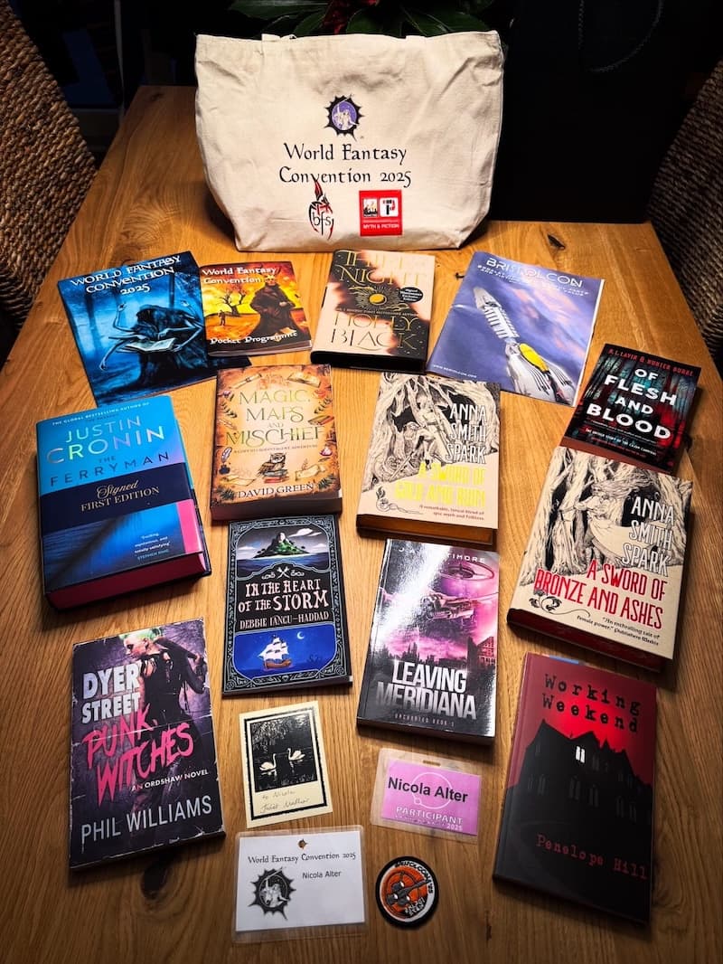 A table strewn with fantasy and science fiction books, programmes, bags, and participant badges from Bristolcon and World Fantasy Convention 2025.