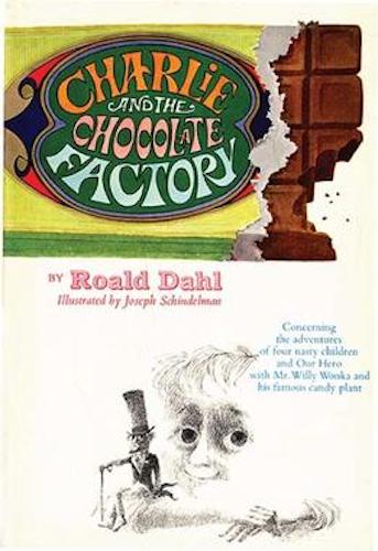 Original book cover of Charlie and the Chocolate Factory by Roald Dahl, illustrated by Joseph Schindelman (first and revised US editions), published by Alfred A. Knopf, Inc., 1964. Image from Wikimedia